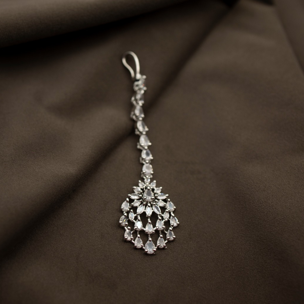 This is an elegantly crafted Silver Plated CZ Maangtika designed to add charm, grace, and sophistication to your traditional or bridal look. Measuring 10 cm in length and 3.2 cm in breadth, this headpiece rests perfectly on the forehead, making it ideal for wedding ceremonies, festive celebrations, and cultural events.