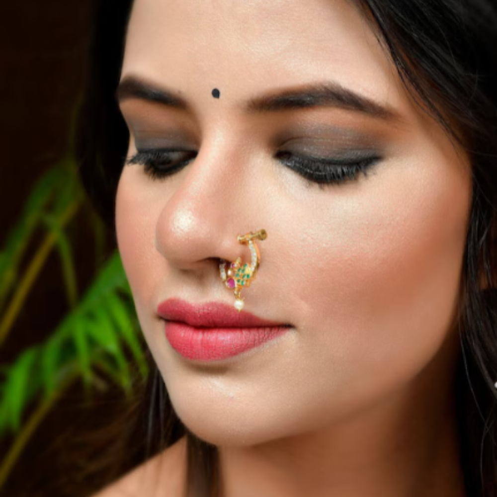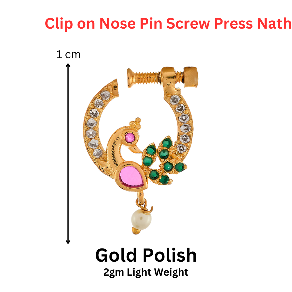 Bring home the beauty of traditional Maharashtrian culture with this Fashion Stylish Fancy Peacock Shape Maharashtrian Screw Press Nath. Inspired by the majestic form of the peacock — the national bird of India and a symbol of grace, royalty, and pride — this nose ring captures the true spirit of Indian femininity. Whether you’re dressing up for Ganesh Chaturthi, Gudi Padwa, or your best friend’s wedding, this beautifully crafted nath instantly enhances your ethnic look.