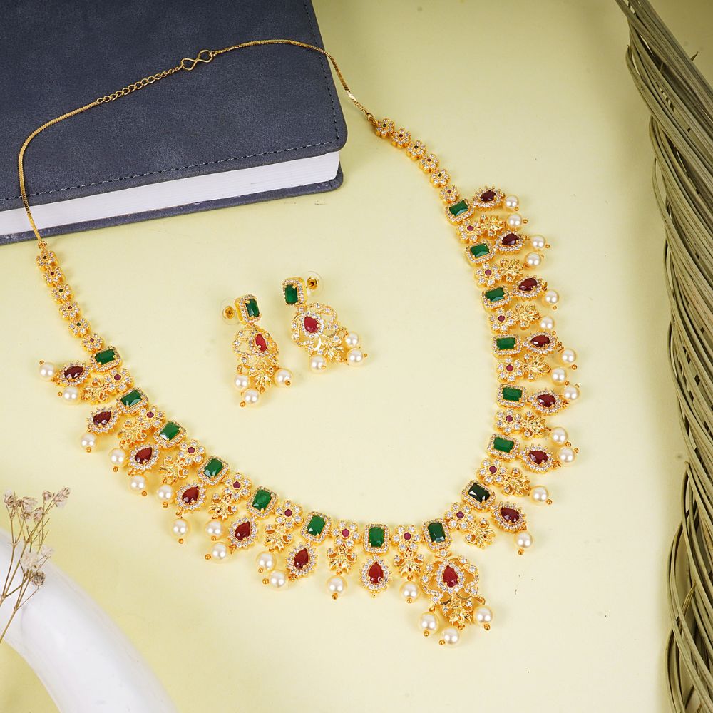 Traditional Gold Plated Multi Color AD American Diamond Jewellery Necklace Set for Women and Girls