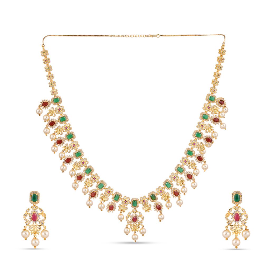 Celebrate Timeless Beauty with the Traditional Gold Plated Multi Color AD American Diamond Jewellery Necklace Set for Women and Girls