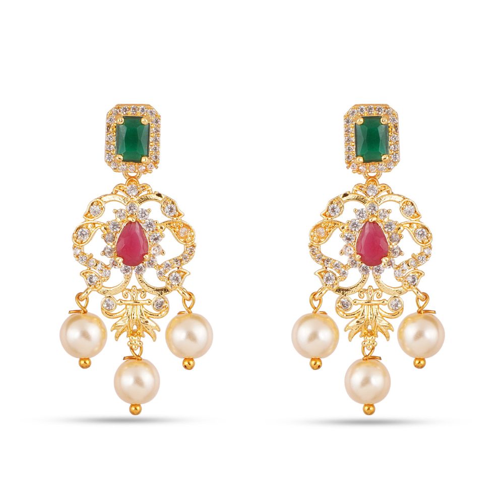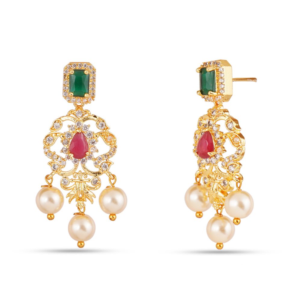 The highlight of this set is its brilliant gold-plated base, which adds a touch of opulence and sophistication. The design is inspired by classic Indian motifs, beautifully enhanced with modern elements for a look that’s both traditional and trendy. Each stone, whether it be red, green, white, or blue, adds a unique charm to the overall composition, allowing the jewelry to match a wide variety of outfits.