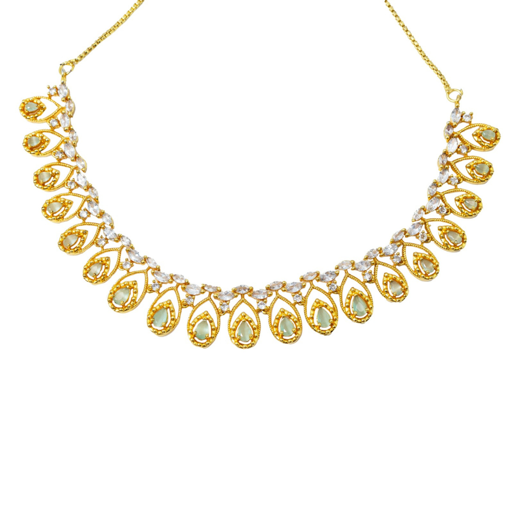 The necklace features finely crafted cubic zirconia (CZ) stones that shimmer brilliantly, creating a luxurious look that rivals real diamonds. The vibrant green stones add a regal touch, perfectly complementing the gold plating for a rich and glamorous finish. Each necklace is carefully designed by skilled artisans to ensure exceptional craftsmanship and long-lasting shine. The matching earrings complete the set beautifully, making it a must-have for every jewelry lover.